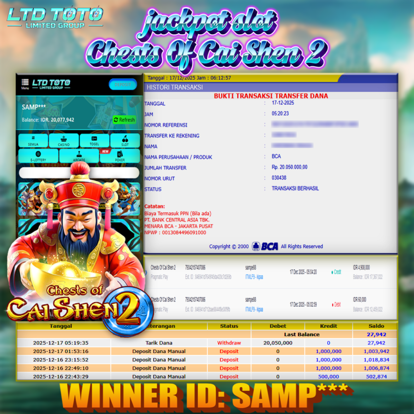 LTDTOTO JACKPOT CHESTS OF CAI SHEN 2 RP 20.050.000 RABU 17 DESEMBER 2025