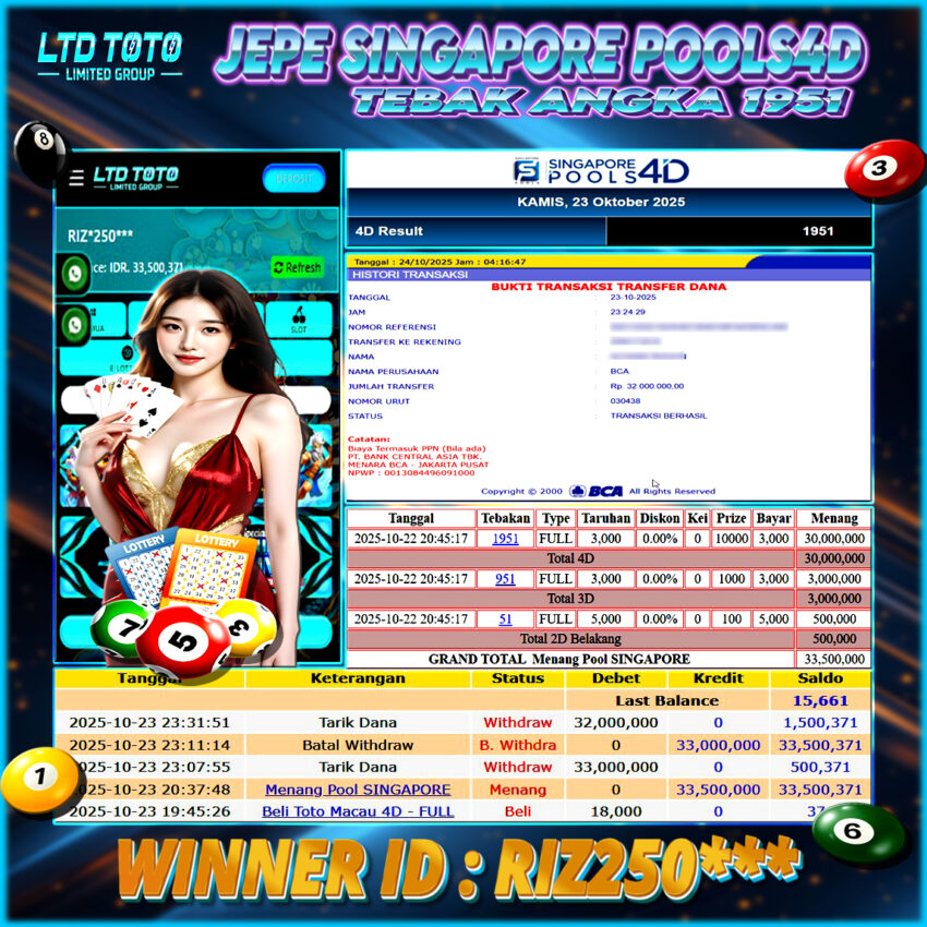 Selamat kepada User id : RIZ250*** Telah berhasil mendapatkan kemenangan besar pada permainan SINGAPORE POOLS4D, kemenangan Sebesar Rp.32.000.000, Setelah mengisi formulir withdraw dengan kurang waktu hanya 5 – 10 menit pihak LTDTOTO sudah melakukan transfer kepada pemilik User id dan dana sudah dapat di cairkan oleh pemenang. Bukti pembayaran yang kami berikan merupakan bukti pembayaran yang SAH / VALID yang langung di dapatkan melaui tanda transfer transaksi dari Bank yang di tuju. Kami mengucapakan banyak Terima Kasih Kepada pemenang karena sudah mempercayakan kami sebagai Bandar Tepercaya yang membayar semua kemenangan member hingga lunas. Masih ragu dengan LTDTOTO bos ? Di mana bandar togel online sekarang yang terpercaya seperti LTDTOTO? Bandar yang mengirimkan kemenangan member tanpa bertele – tele. Jadi…. tidak perlu khwatir pada situs LTDTOTO karena kemenangan anda berapapun akan dibayarakan hingga lunas kepada pemenang.